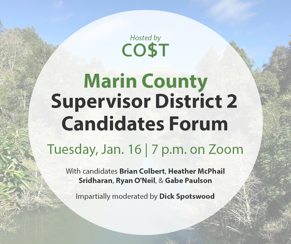 The outcome of this election affects EVERYONE in the county. The Board of Supervisors will likely be making important decisions impacting housing supply, affordability, and local control; homelessness; rent regulation; climate change initiatives; flood control; wildfire risk; open space; local taxes and fees; and other hot topics.CO$T is pleased that this impartial forum will once again be moderated by the Marin IJ’s political columnist, Dick Spotswood. Attendees are invited to submit questions when they register as well as during the forum.